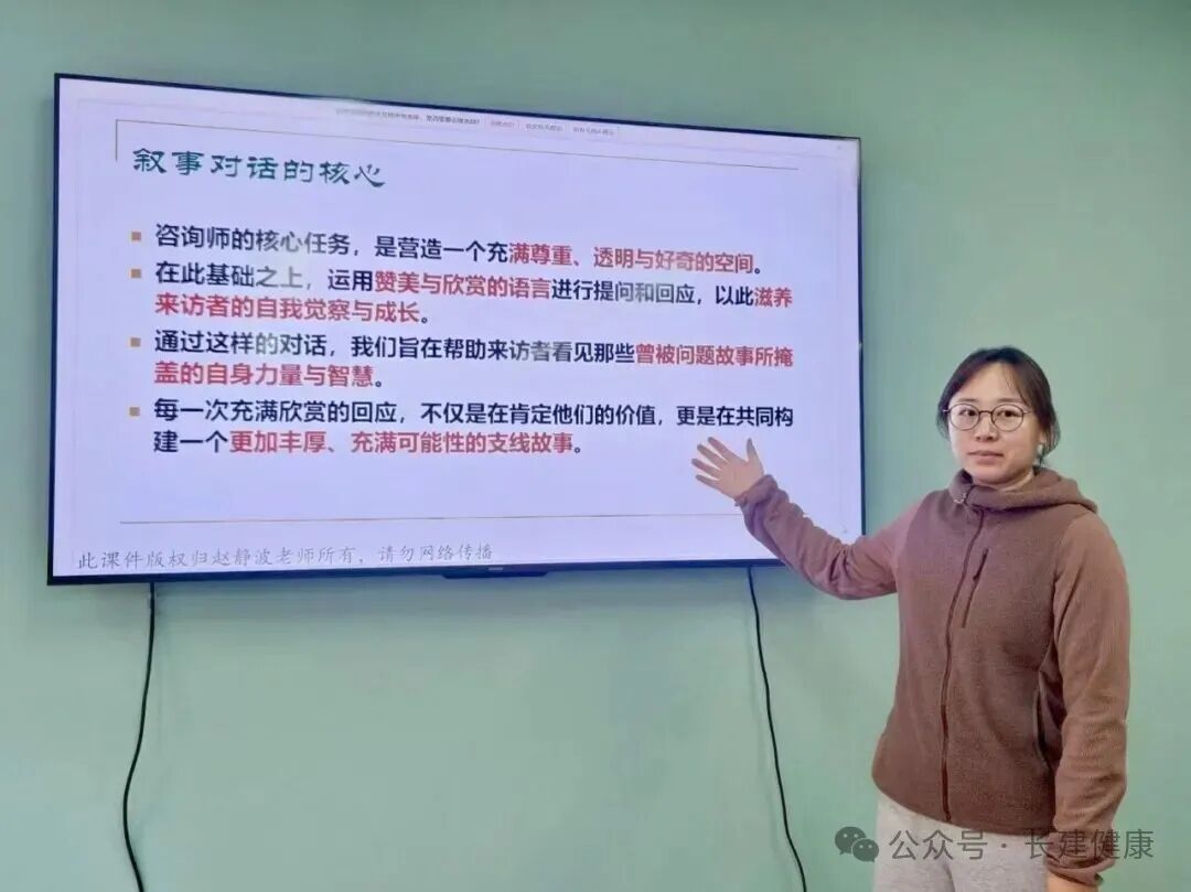 分享会上,参训辅导员王妍、张笑也结合日常学生工作中的真实案例,深入交流培训感悟与实践思考。她们谈到,“叙事疗法”所倡导的尊重学生个体差异、挖掘内在成长潜能的核心理念,与高校立德树人的根本任务高度契合。后续工作中,辅导员们将把培训所学的专业方法灵活融入学生谈心谈话、心理危机干预等具体场景,以更具专业性和温度的视角倾听学生心声,引导学生正视成长困惑、梳理情绪脉络,通过构建积极叙事帮助学生重塑成长信心,为学生身心健康发展与全面成长保驾护航。