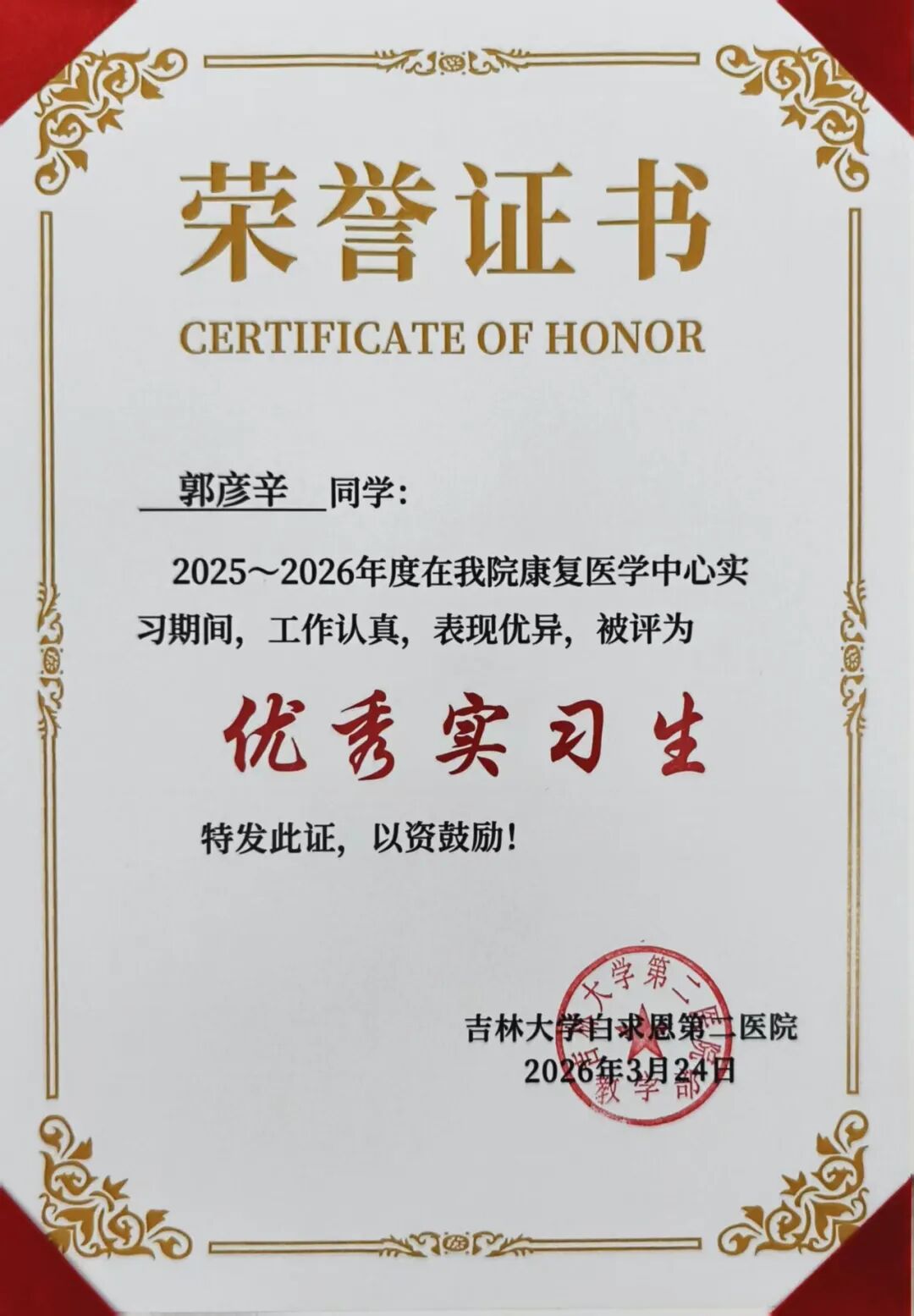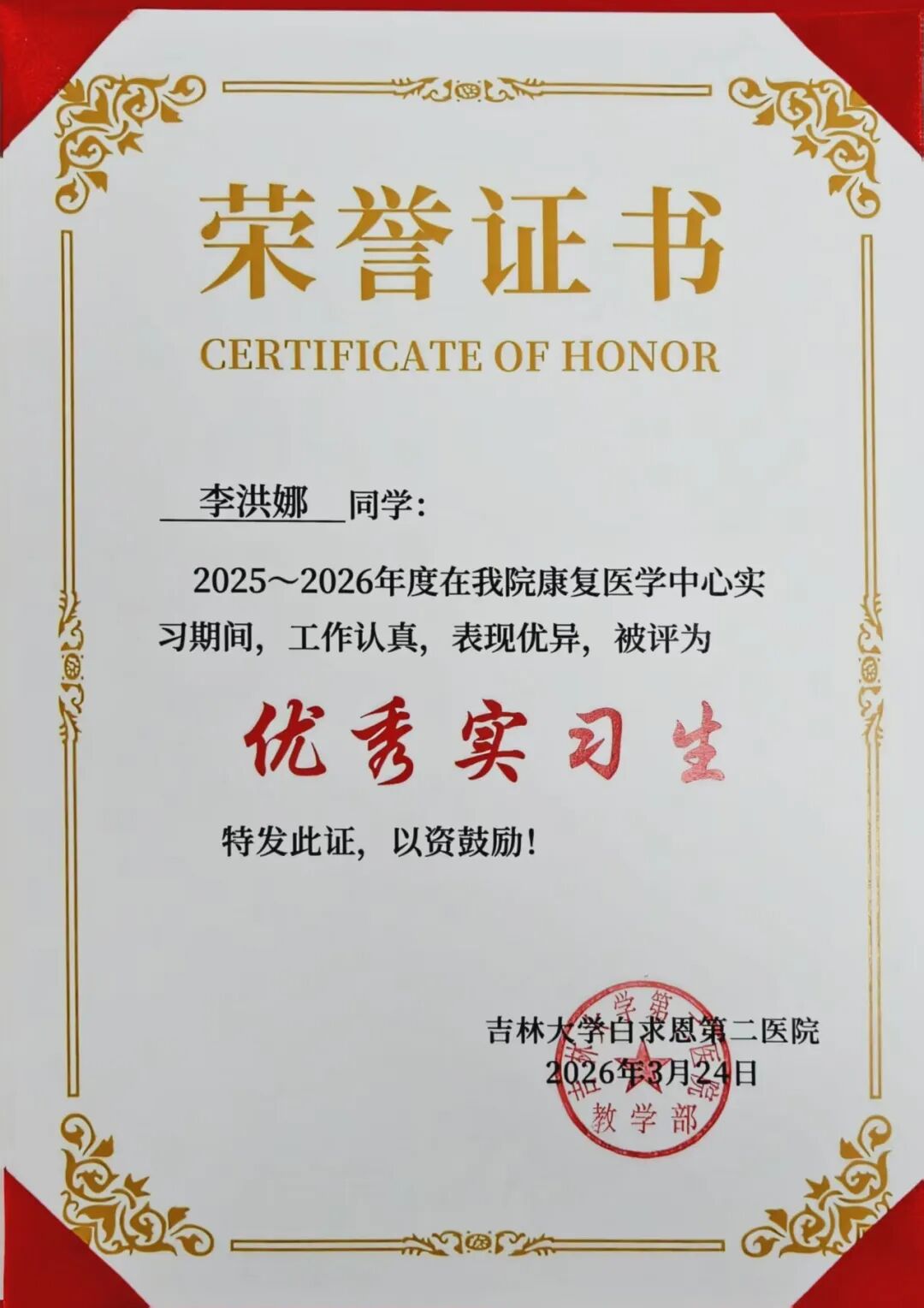 喜报||健康产业学院7名学子在吉林大学白求恩第二医院康复医学科2025-2026学年实习阶段荣获“优秀实习生”称号