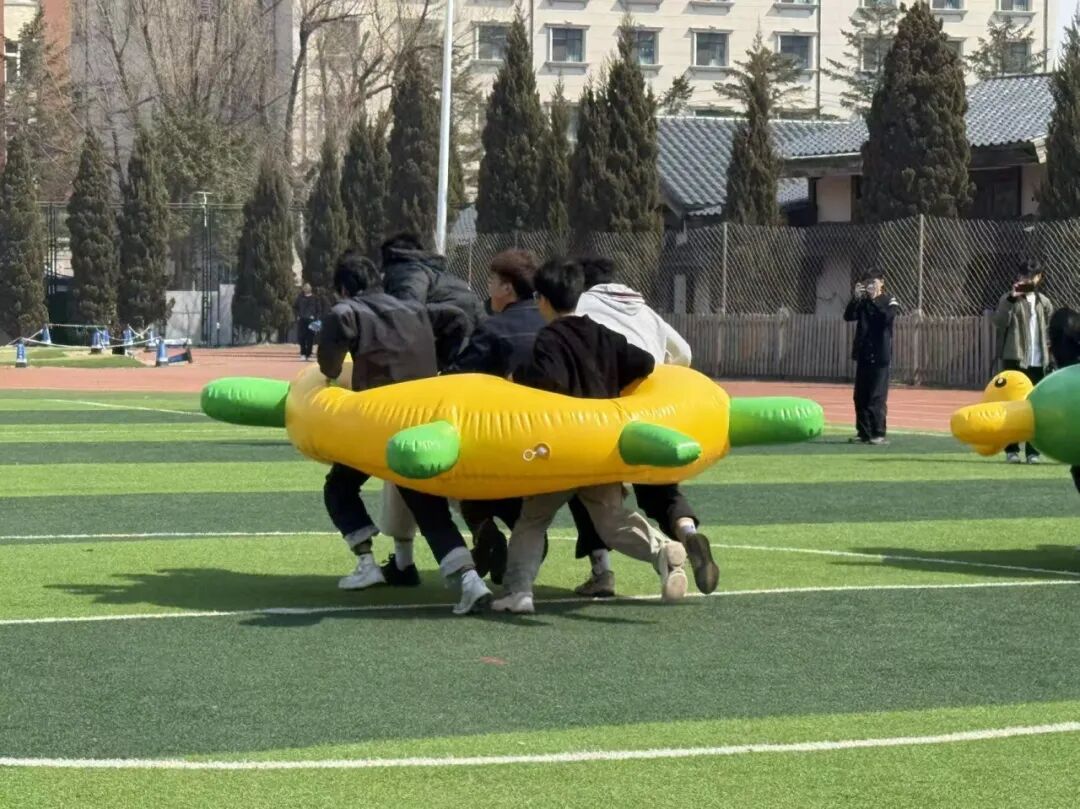 “龟兔竞速”协作挑战赛,将团队精神演绎得淋漓尽致,队员们一同钻入巨型充气道具,双手紧握内侧支点,整齐列队、蓄势待发。发令枪响,全队步调一致、口号铿锵,凭借高度默契的配合奋勇争先,最终斩获第一名。这不仅是速度与力量的比拼,更是意志与凝聚力的检阅。在并肩前行的过程中,团队协作的力量不断凝聚,青春风采与集体荣誉感蓬勃生长。